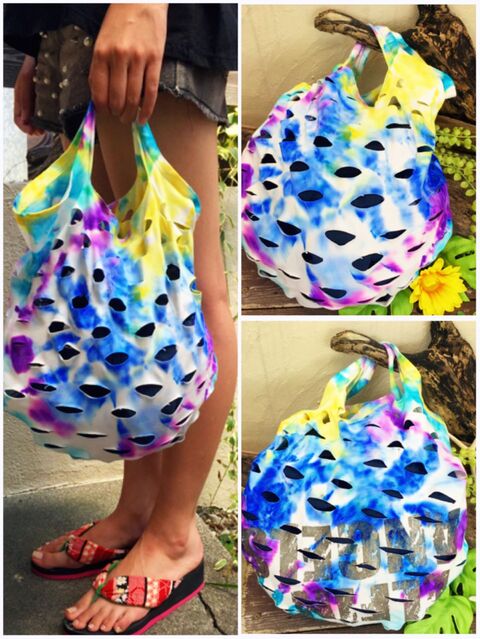 簡単tシャツリメイク チョキチョキカットと結ぶだけでエコバッグを作