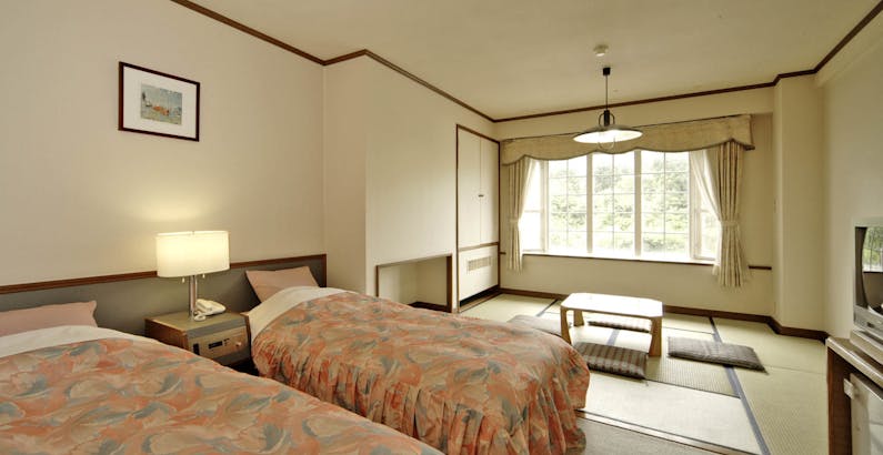 シングルベッド2台の洋室と6畳ほどの和室の部屋でした 和室には 布団